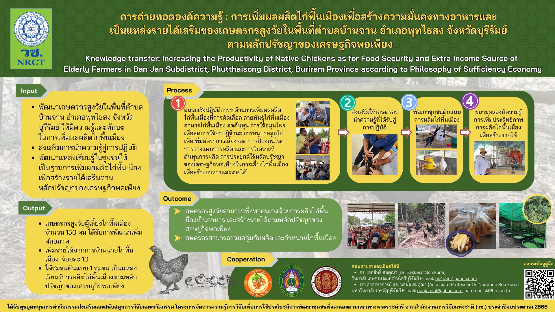 วัตถุประสงค์ของการดําเนินกิจกรรมการถ่ายทอดองค์ความรู้การถ่ายทอดองค์ความรู้: การเพิ่มผลผลิต ไก่พื้นเมืองเพื่อสร้างความมั่นคงทางอาหารและเป็นแหล่งรายได้เสริมของเกษตรกรสูงวัยในพื้นที่ตําบลบ้านจาน อําเภอพุทไธสง จังหวัดบุรีรัมย์ตามหลักปรัชญาของเศรษฐกิจพอเพียง เพื่อพัฒนาเกษตรกรสูงวัยในพื้นที่ตําบล บ้านจาน อําเภอพุทไธสง จังหวัดบุรีรัมย์ ให้มีความรู้และทักษะในการเพิ่มผลผลิตไก่พื้นเมืองให้เป็นแหล่ง อาหารและสร้างรายได้เสริมตามหลักปรัชญาของเศรษฐกิจพอเพียง ส่งเสริมการเลี้ยงไก่พื้นเมืองให้เป็นแหล่ง อาหารและสร้างรายได้เสริมให้กับครัวเรือนของเกษตรกรสูงวัย และพัฒนาแหล่งเรียนรู้ในชุมชนให้เป็นฐาน การเพิ่มผลผลิตไก่พื้นเมืองเพื่อสร้างรายได้เสริมตามหลักปรัชญาของเศรษฐกิจพอเพียง ในพื้นที่ตําบลบ้านจาน อําเภอพุทไธสง จังหวัดบุรีรัมย์ ได้ดําเนินกิจกรรมตามแผนงานที่กําหนดไว้ โดยศึกษาข้อมูลบริบทพื้นที่และ เกษตรกรเป้าหมาย อบรมถ่ายทอดองค์ความรู้ เทคโนโลยี และนวัตกรรมการผลิตไก่พื้นเมืองเพื่อสร้างรายได้ ในพื้นที่เป้าหมาย 6 เรื่อง มีเกษตรกรที่เข้ากิจกรรมการอบรมถ่ายทอดองค์ความรู้ จํานวน 150 คน เป็น เกษตรกรผู้เลี้ยงไก่พื้นเมืองในพื้นที่ตําบลบ้านจาน ผู้นําชุมชนของแต่ละหมู่บ้าน และเจ้าหน้าที่องค์การบริหาร ส่วนตําบลบ้านจาน จํานวน 4 คน และเกษตรกรในพื้นที่บ้านหนองติ้ว ตําบลคูเมือง อําเภอคูเมือง จังหวัด บุรีรัมย์ จํานวน 30 คน ขยายผลด้วยการส่งเสริมการนําองค์ความรู้สู่การปฏิบัติ มีจํานวนเกษตรกรที่นําความรู้ ไปปฏิบัติได้ถูกต้อง จํานวน 30 ราย ได้ชุมชนต้นแบบจํานวน 1 ชุมชน คือ ชุมชนบ้านจาน ตําบลบ้านจาน ที่สามารถนําองค์ความรู้ที่ได้รับจากการดําเนินโครงการไปเพิ่มประสิทธิภาพการผลิตก่พื้นเมืองเพื่อเป็นอาหาร และสร้างรายได้ สามารถพึ่งพาตนเองตามหลักปรัชญาของเศรษฐกิจพอเพียง มีการวัดและประเมินผลการนํา ความรู้สู่การปฏิบัติในชุมชน ด้วยการใช้แบบสอบถามแบบสัมภาษณ์ และการสังเกต พบว่า เกษตรกรสามารถ นําไปประยุกต์ใช้ในการเลี้ยงไก่พื้นเมือง จํานวนไก่พื้นเมืองเมื่อเสร็จสิ้นโครงการเพิ่มขึ้น ทั้งนี้เนื่องจากเกษตรกร นําความรู้ไปปรับกระบวนการเลี้ยงไก่พื้นเมือง จากการปล่อยเลี้ยงตามธรรมชาติ มาเป็นการเลี้ยงแบบกึ่งขังกึ่ง ปล่อยมีการปรับเปลี่ยนการเลี้ยงลูกไก่ไว้กับแม่ไก่ มาเป็นการแยกอนุบาลลูกไก่เพื่อเพิ่มอัตราการเลี้ยงรอด และ การเพาะเลี้ยงแหนแดงเป็นแหล่งอาหารเสริมโปรตีน ด้วยการใช้แหนแดงผสมในอาหาร เช่น 