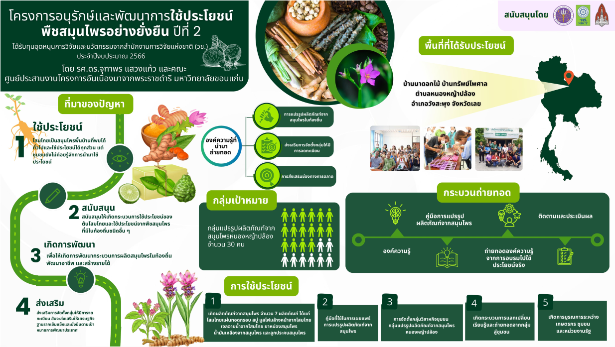 โครงการอนุรักษ์และพัฒนาการใช้ประโยชน์พืชสมุนไพรในท้องถิ่นอย่างยั่งยืน ปีที่ 2 ได้ดำเนินงานในพื้นที่ ตำบลหนองหญ้าปล้อง อำเภอวังสะพุง จังหวัดเลย ซึ่งเป็นชุมชนที่อยู่รอบพื้นที่สนองพระราชดำริโครงการ อนุรักษ์พันธุกรรมพืชอันเนื่องมาจากพระราชดำริฯ (อพ.สธ.) ของมหาวิทยาลัยขอนแก่น มีวัตถุประสงค์เพื่อ 1) เพื่อสนองพระราชดำริโครงการอนุรักษ์พันธุกรรมพืชอันเนื่องมาจากพระราชดำริฯ (อพ.สธ.) 2) เพื่อนำองค์ ความรู้ด้านสมุนไพรในท้องถิ่นมาสู่กระบวนการอนุรักษ์และใช้ประโยชน์อย่างยั่งยืน 3) เพื่อพัฒนากระบวนการ ผลิตสมุนไพรในท้องถิ่น พัฒนาอาชีพ และสร้างรายได้ 4) เพื่อส่งเสริมชุมชนพึ่งตนเองด้วยการพัฒนางานด้าน ศิลปะ วัฒนธรรม ภูมิปัญญาท้องถิ่น และอัตลักษณ์ประจำถิ่นสู่การพัฒนาชุมชนอย่างยั่งยืน การดำเนินกิจกรรม มีกลุ่มเป้าหมายจำนวน 30 คน โดยนำองค์ความรู้ เทคโนโลยี และนวัตกรรมจากผู้เชี่ยวชาญใน มหาวิทยาลัยขอนแก่นและหน่วยงานภาคีที่เกี่ยวข้อง ในการส่งเสริมและสนับสนุนให้เกิดกระบวนการใช้ ประโยชน์ของสมุนไพรในท้องถิ่น นำองค์ความรู้จากการอบรมไปใช้ประโยชน์จริง การดำเนินโครงการมีการ พัฒนาผลิตภัณฑ์จากพืชสมุนไพรโสมไทยและพืชสมุนไพรในท้องถิ่นชนิดอื่น ๆ ส่งเสริมการจัดตั้งกลุ่มให้มีการ จดทะเบียน ส่งเสริมการตลาดพร้อมทั้งนำผลิตภัณฑ์ไปทดสอบตลาด พร้อมทั้งการดำเนินโครงการทำให้ได้ผล ผลิตเกิดเป็นคู่มือการถ่ายทอดองค์ความรู้ เกิดเป็นผลิตภัณฑ์จำนวน 7 ผลิตภัณฑ์ คือ โสมไทยแผ่นทอดกรอบ สบู่ มูสโฟมล้างหน้าจากโสมไทย เจลอาบน้ำจากโสมไทย ยาหม่องสมุนไพร น้ำมันเหลืองจากสมุนไพร และ ลูกประคบสมุนไพร หลังการดำเนินโครงการมีข้อเสนอแนะว่า การส่งเสริมพัฒนาผลิตภัณฑ์ของกลุ่มผู้ผลิตต้อง เน้นการติดตามการรักษาคุณภาพมาตรฐานของผลิตภัณฑ์ และสนับสนุนด้านการตลาด รวมถึงการบริหาร จัดการกลุ่มให้มีความเข็มแข็งและยั่งยืนต่อไป