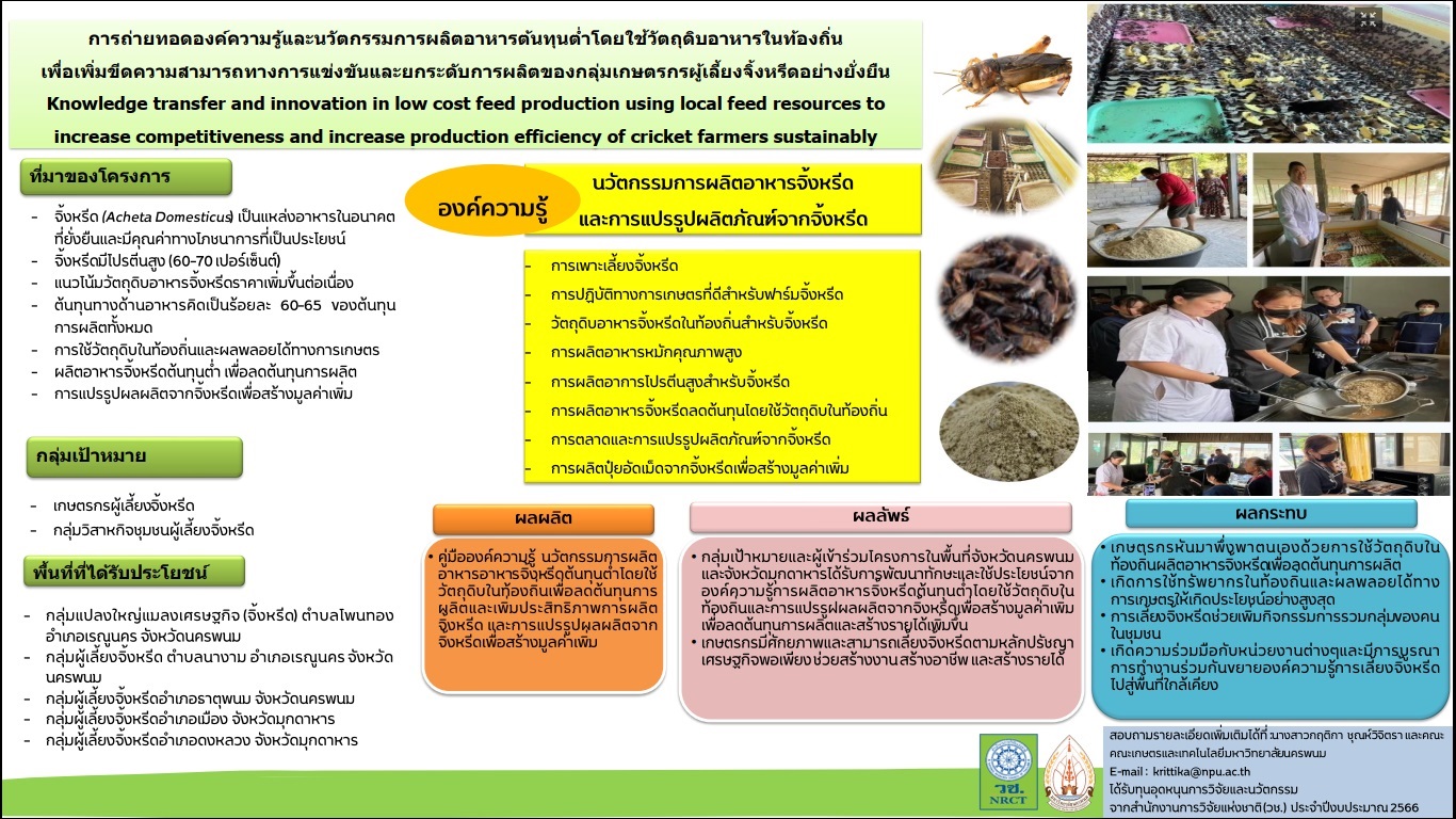 ปัจจุบันการเลี้ยงจิ้งหรีดได้รับความนิยมอย่างสูงและกำลังเป็นที่ต้องการของตลาดอย่างยิ่ง ซึ่ง องค์การอาหารและเกษตรแห่งสหประชาชาติ (Food and Agricultural Organization, FAO) แนะนำให้ แมลง เป็นอาหารสำหรับประชากรในอนาคตเนื่องจากเป็นแหล่งโปรตีนชั้นดี ซึ่งจิ้งหรีดเป็นแมลงเศรษฐกิจ อย่างหนึ่งที่ได้รับความนิยมทั้งในประเทศและต่างประเทศ ทำให้เกิดอุตสาหกรรมการเพาะเลี้ยงจิ้งหรีดเชิง พาณิชย์ การเลี้ยงจิ้งหรีดในประเทศไทยนิยมเลี้ยงกันมากขึ้นเนื่องจากหาวัสดุที่หาได้ในท้องถิ่นและลงทุนต่ำ โดยการเลี้ยงจิ้งหรีดให้ได้คุณภาพต้องคำนึงถึงปัจจัยที่สำคัญได้แก่ สายพันธุ์ อาหารที่ใช้เลี้ยงจิ้งหรีด และ การจัดการฟาร์ม อย่างไรก็ตามปัจจัยที่สำคัญคือต้นทุนทางด้านอาหารจิ้งหรีดมากถึง ร้อยละ 60-70 ซึ่ง ปัจจุบันราคาวัตถุดิบมีการปรับตัวเพิ่มสูงขึ้นอย่างต่อเนื่องทำให้กลุ่มเกษตรกรผู้เลี้ยงจิ้งหรีดต้องแบก รับภาระต้นทุนทางด้านอาหารที่สูงขึ้น ทำให้เกษตรกรมีผลกำไรลดลง คณะผู้วิจัยจึงได้นำองค์ความรู้มา พัฒนาการนำใช้วัตถุดิบที่มีในท้องถิ่นเพื่อนำมาเป็นอาหารจิ้งหรีดต้นทุนต่ำเพื่อลดต้นทุนการผลิตจึงเป็นสิ่งที่ สำคัญอย่างยิ่ง เพื่อเป็นการช่วยเหลือเกษตรกรในการลดต้นทุนการผลิต และเกษตรกรสามารถลดการพึ่งพา ปัจจัยภายนอก มีรายได้เพิ่มขึ้นมีชีวิตความเป็นอยู่ที่ดีขึ้นตามหลักปรัชญาเศรษฐกิจพอเพียง สำหรับองค์ ความรู้และนวัตกรรมที่จะถ่ายทอดสู่กลุ่มเกษตรกร ได้แก่ การผลิตอาหารจิ้งหรีดต้นทุนต่ำโดยใช้วัตถุดิบใน ท้องถิ่น การผลิตอาหารโปรตีนสูงสำหรับจิ้งหรีด การผลิตอาหารหมักโดยใช้เชื้อยีสต์ การเพิ่มมูลค่าจิ้งหรีด ด้วยการแปรรูป ได้แก่ ข้าวเกรียบจิ้งหรีด ข้าวเกรียบจิ้งหรีดผสมสมุนไพรรสต้มยำ น้ำพริกนรกจิ้งหรีด เป็น ต้น การผลิตปุ๋ยจากมูลจิ้งหรีดอัดเม็ด จำนวนผู้เข้ารับการถ่ายทอดทั้งหมด 250 ราย ในพื้นที่จังหวัด นครพนม และจังหวัดมุกดาหาร สรุปผลการดำเนินการถ่ายทอดองค์ความรู้เกษตรกรที่เข้าร่วมรับการ ถ่ายทอดองค์ความรู้มีผลการทดสอบความรู้ก่อนรับการถ่ายทอดองค์ความรู้เท่ากับร้อยละ 31.4 มีค่าผลการ ทดสอบหลังรับการถ่ายทอดองค์ความรู้เท่ากับร้อยละ 78.9 ซึ่งผู้เข้ารับการอบรมมีค่าผลการทดสอบหลังรับ การถ่ายทอดองค์ความรู้สูงกว่าก่อนรับการถ่ายทอดองค์ความรู้ร้อยละ 47.5 นอกจากนี้ผลการประเมิน ความพึงพอใจและการนำความรู้ไปใช้ประโยชน์ในระดับความพึงพอใจมากที่สุดเกษตรกรสามารถนำความรู้ ที่ได้จากการฝึกอบรมไปใช้ปฏิบัติได้ในฟาร์มของตนเอง หลังจากการถ่ายทอดองค