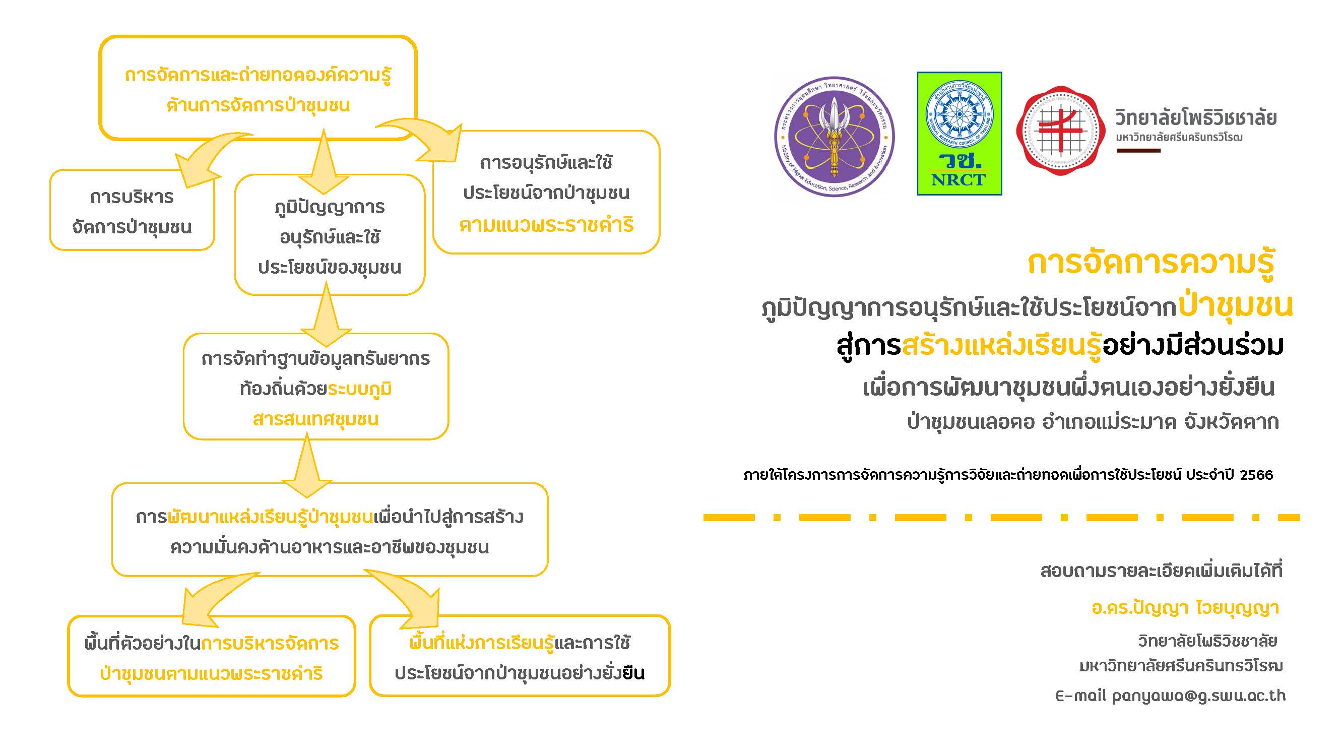 กระบวนการถอดองค์ความรู้ การถ่ายทอด และการพัฒนาแหล่งเรียนรู้ให้กับชุมชนอย่างมีส่วนร่วม ผลที่ได้จากการจะเป็นเครื่องมือสำคัญที่สามารถนำไปใช้เป็นในการบริหารจัดการทรัพยากรธรรมชาติและสิ่งแวดล้อมเพื่อสร้างความสมดุลและยั่งยืนของดิน น้ำ ป่า และคนของชุมชนเลอตอ งานวิจัยนี้มีวัตถุประสงค์การวิจัย ประกอบด้วย 1) เพื่อจัดการและถ่ายทอดองค์ความรู้ด้านการจัดการป่าชุมชน และการบริหารจัดการป่าชุมชนตามแนวพระราชดำริและภูมิปัญญาของชุมชน 2) เพื่อจัดทำฐานข้อมูลทรัพยากรท้องถิ่นด้วยระบบภูมิสารสนเทศชุมชน และ 3) พัฒนาแหล่งเรียนรู้ป่าชุมชนเพื่อนำไปสู่การสร้างความมั่นคงด้านอาหารและอาชีพของชุมชน โดยมีวิธีในการดำเนินการ 3 ขั้นตอน ได้แก่ การถ่ายทอดและถอดองค์ความรู้ด้านการบริหารจัดการป่าชุมชน การจัดทำฐานข้อมูลทรัพยากรท้องถิ่นด้วยระบบภูมิสารสนทศชุมชน ป่าชุมชนบ้านเลอตอ และการพัฒนาแหล่งเรียนรู้เพื่อการพัฒนาชุมชนอย่างยั่งยืน ผลการวิจัย พบว่า ชุมชนได้รับการถ่ายทอดและถอดองค์ความรู้ แนวคิดการพัฒนาชุมชนอย่างยั่งยืน แนวพระราชดำริในการอนุรักษ์และจัดการป่า การถอดองค์ความรู้ ด้านการบริหารจัดการป่าชุมชน ภูมิปัญญาในการอนุรักษ์และการใช้ประโยชน์ ทำให้เกิดชุดความรู้ในเรื่อง ข้อมูลทั่วไปเกี่ยวกับชุมชน ปฏิทินทางวัฒนธรรม ป่าชุมชน การบริหารจัดการป่าชุมชน และการใช้ประโยชน์จากป่าชุมชน ด้านการจัดทำฐานข้อมูลทรัพยากรท้องถิ่นด้วยระบบภูมิสารสนเทศชุมชนป่าชุมชนบ้านเลอตอ ได้จัดทำแผนที่ทรัพยากรที่สำคัญในแสดงตำแหล่งที่ตั้งของสถานที่สำคัญในชุมชนทั้ง ไม้เด่นที่พบในป่าชุมชน และแผนที่การเรียนรู้ในพื้นที่ชุมชนบ้านเลอตอ และด้านการพัฒนาแหล่งเรียนรู้เพื่อการพัฒนาชุมชนอย่างยั่งยืน สามารถแบ่งได้เป็นฐานการเรียนรู้ต่าง ๆ ได้แก่ ฐานการเรียนรู้ฝายชะลอน้ำตามแนวพระราชดำริ ฐานการเรียนรู้ธนาคารอาหารชุมชน (Food Bank) ตามแนวพระราชดำริ และฐานการเรียนรู้เรื่องอาหารและผลิตภัณฑ์ และการพัฒนาผลิตภัณฑ์จากป่าชุมชน ซึ่งใช้น้ำผึ้งจากป่าชุมชนเป็นกรณีศึกษา แสดงให้เห็นการใช้ประโยชน์จากป่าชุมชนเพื่อให้เกิดความยั่งยืนกับพื้นที่