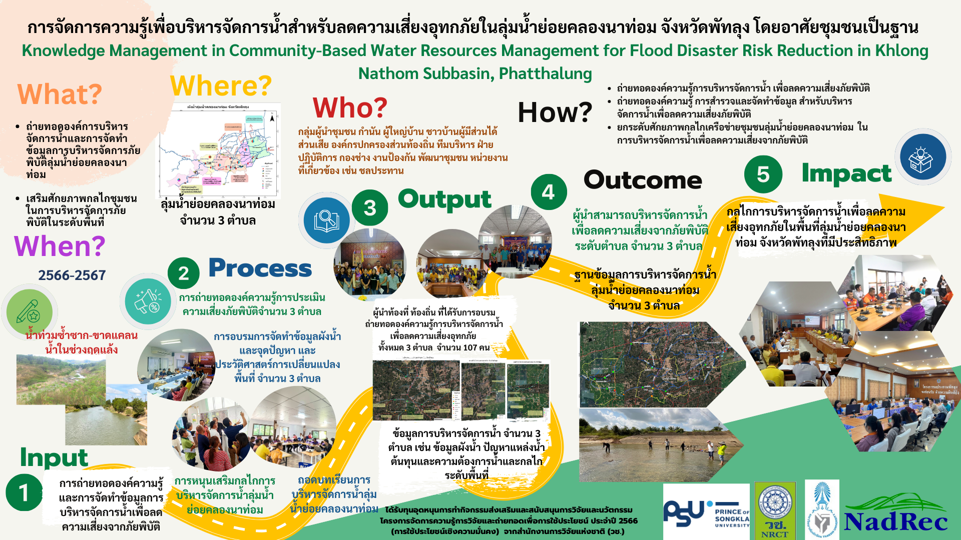 โครงการการจัดการความรู้เพื่อบริหารจัดการน้ำสำหรับลดความเสี่ยงอุทกภัยในลุ่มน้ำย่อยคลองนาท่อม จังหวัดพัทลุง โดยอาศัยชุมชนเป็นฐาน มีวัตถุประสงค์ ได้แก่ 1) เพื่อถ่ายทอดองค์ความรู้การบริหารจัดการน้ำ เพื่อลดความเสี่ยงอุทกภัย ลุ่มน้ำย่อยคลองนาท่อม จังหวัดพัทลุง 2) เพื่อถ่ายทอดองค์ความรู้ การสำรวจและจัดทำข้อมูล สำหรับบริหารจัดการน้ำเพื่อลดความเสี่ยงอุทกภัย ลุ่มน้ำย่อยคลองนาท่อม จังหวัดพัทลุง 3) เพื่อยกระดับศักยภาพกลไกเครือข่ายชุมชนลุ่มน้ำย่อยคลองนาท่อม จังหวัดพัทลุง ในการบริหารจัดการน้ำเพื่อลดความเสี่ยงจากอุทกภัย โดยมีกระบวนการถ่ายทอดองค์ความรู้ เรื่องการการบริหารจัดการน้ำจากอุทกภัย การจัดทำข้อมูลสนับสนุนการบริหารจัดการน้ำเพื่อลดความเสี่ยงจากอุทกภัยระดับชุมชนจำนวน 3 ตำบล และการเสริมศักยภาพกลไกชุมชนเพื่อลดความเสี่ยงจากอุทกภัยของชุมชน