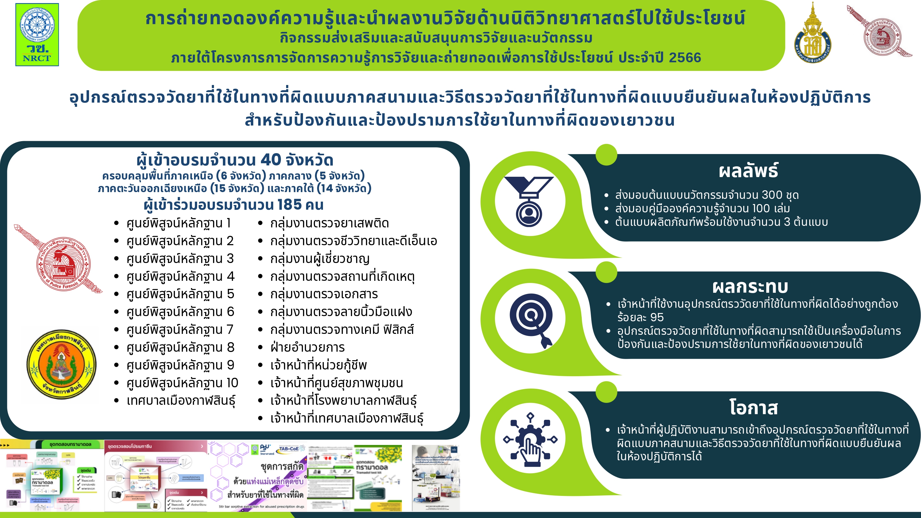 ปัญหาการใช้ยารักษาโรคในทางที่ผิดของกลุ่มเยาวชน นักเรียนและนักศึกษาในประเทศไทยมีแนวโน้มสูงขึ้น ยารักษาโรคที่นำมาใช้ในทางที่ผิดนิยมเสพในรูปของเครื่องดื่มสูตรผสม มักรู้จักกันในชื่อสูตรยาโปรและลีน ค็อกเทล โดยนำยารักษาโรคผสมกับเครื่องดื่มน้ำอัดลม เครื่องดื่มชูกำลังหรือน้ำต้มใบกระท่อม การเสพเครื่องดื่มสูตรผสมอาจก่อให้เกิดอาการไม่พึงประสงค์และเป็นสาเหตุการเสียชีวิตได้ ดังนั้นการตรวจวิเคราะห์ชนิดของยาและความเข้มข้นของยาในเครื่องดื่มต้องสงสัยจึงมีความสำคัญต่อหน่วยงานพิสูจน์หลักฐานตำรวจ คณะทำงานดำเนินการถ่ายทอดองค์ความรู้ให้กับกลุ่มเป้าหมายผ่านการจัดกิจกรรมอบรมเชิงปฏิบัติการในหัวข้อเรื่อง อุปกรณ์ตรวจวัดยาที่ใช้ในทางที่ผิดแบบภาคสนามและวิธีตรวจวัดยาที่ใช้ในทางที่ผิดแบบยืนยันผลในห้องปฏิบัติการสำหรับป้องกันและป้องปรามการใช้ยาในทางที่ผิดของเยาวชนเพื่อให้ผู้เข้าอบรมได้ทราบถึงการแพร่ระบาดและอันตรายของการใช้ยารักษาโรคในทางที่ผิด เข้าใจหลักการและวิธีการใช้งานอุปกรณ์ตรวจวัดยาที่ใช้ในทางที่ผิดแบบภาคสนาม (ชุดทดสอบทรามาดอลและชุดตรวจสอบโปรเมทาซีน) และวิธีตรวจวัดยาที่ใช้ในทางที่ผิดแบบยืนยันผลในห้องปฏิบัติการ (ชุดการสกัดด้วยแท่งแม่เหล็กดูดซับ) คณะทำงานดำเนินการถ่ายทอดองค์ความรู้ให้กับกลุ่มเปIาหมายจำนวน 8 ครั้ง มีผู้เข้าร่วมรับการอบรมจำนวน 185 คน ประกอบด้วยตำรวจพิสูจน4หลักฐานจำนวน 159 คน และเจ้าหน้าที่หน่วยงานภาครัฐที่เกี่ยวข้อง (เจ้าหน้าที่หน่วยกู้ชีพ เจ้าหน้าที่ศูนย์สุขภาพชุมชน เจ้าหน้าที่พยาบาลและเจ้าหน้าที่เทศบาล) จำนวน 26 คน ซึ่งเป็นตัวแทนของหน่วยงานจาก 40 จังหวัดทั่วประเทศ หลังการอบรมคณะทำงานส่งมอบชุดทดสอบทรามาดอล ชุดตรวจสอบโปรเมทาซีนและชุดการสกัดด้วยแท่งแม่เหล็กดูดซับสำหรับยาที่ใช้ในทางที่ผิดให้แก่หน่วยงานศูนย์พิสูจน์หลักฐาน (1–10) รวมทั้งสิ้น 300 ชุด และจัดทำคู่มือองค์ความรู้อุปกรณ์ตรวจวัดยาที่ใช้ในทางที่ผิดแบบภาคสนามและวิธีตรวจวัดยาที่ใช้ในทางที่ผิดแบบยืนยันผลในห้องปฏิบัติการจำนวน 100 เล่ม และแจกจ่ายไปยังหน่วยงานต่าง ๆ ที่เกี่ยวข้องทั่วประเทศผลการประเมินการจัดอบรมเชิงปฏิบัติการจากผู้ทำแบบสอบถามจำนวน 166 คน คิดเป็นร้อยละ 90 ของผู้เข้าร่วมกิจกรรม พบว่านวัตกรรมอุปกรณ4ตรวจวัดยาที่ใช้ในทางที่ผิดแบบภาคสนามและวิธีตรวจวัดยาที่ใช้ในทางที่ผิดแบบยืนยันผลในห้องปฏิบัติการมีความเหมาะสมต่อการใช้งานจริงทั้งในห้องปฏิบัติการและภาคสนาม (ประเมินความพึงพอใจระดับ