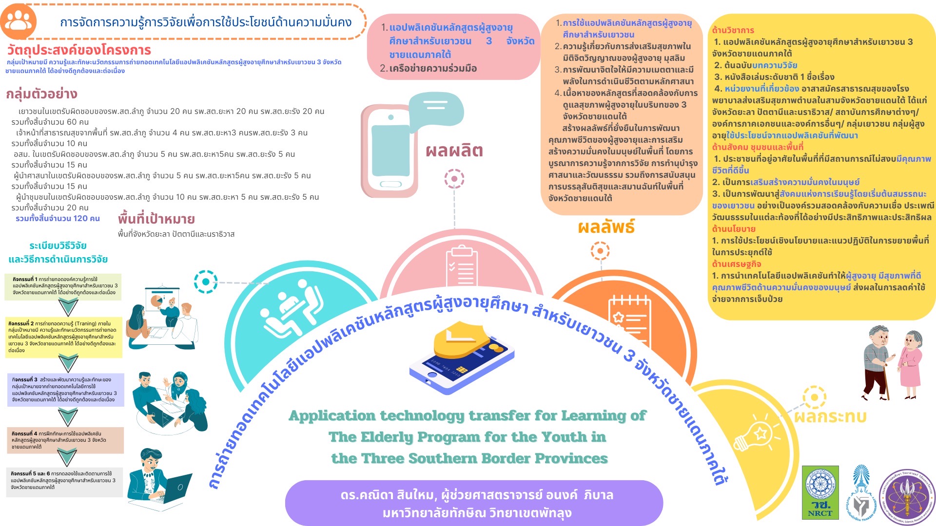 โดยสรุป การถ่ายทอดเทคโนโลยีผ่านแอปพลิเคชันนี้ไม่เพียงช่วยเสริมสร้างความรู้และทักษะด้านผู้สูงอายุศึกษาแก่เยาวชน แต่ยังเป็นต้นแบบนวัตกรรมที่ตอบโจทย์สังคมพหุวัฒนธรรม ช่วยยกระดับคุณภาพชีวิต สร้างความมั่นคงของมนุษย์ และนำไปสู่การสมานฉันท์และสันติสุขในพื้นที่จังหวัดชายแดนภาคใต้ได้อย่างเป็นรูปธรรม