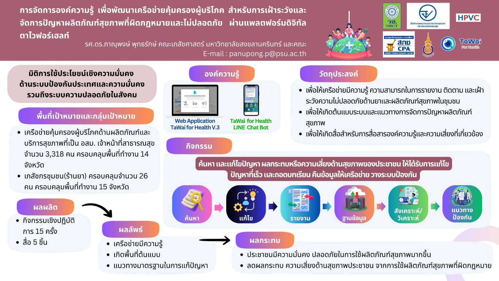 ปัจจุบันประชาชนจำนวนมากกำลังเผชิญความเสี่ยงจากการบริโภคผลิตภัณฑ์สุขภาพที่ผิดกฎหมายและไม่ได้มาตรฐาน ซึ่งปัญหานี้ทวีความรุนแรงขึ้นเนื่องจากผลิตภัณฑ์เหล่านี้เข้าถึงผู้บริโภคได้ง่ายและขาดกระบวนการจัดการที่เหมาะสม โครงการ "การจัดการองค์ความรู้เพื่อพัฒนาเครือข่ายคุ้มครองผู้บริโภค สำหรับการเฝ้าระวังและจัดการปัญหาผลิตภัณฑ์สุขภาพที่ผิดกฎหมายและไม่ปลอดภัยในชุมชน ผ่านแพลตฟอร์มดิจิทัล TaWai for Health" จึงจัดทำขึ้นเพื่อพัฒนาเครือข่ายให้มีความสามารถในการรายงาน ติดตาม และเฝ้าระวังผลิตภัณฑ์สุขภาพที่ผิดกฎหมายและอันตรายได้อย่างถูกต้องเหมาะสม พร้อมพัฒนาต้นแบบและแนวทางการจัดการปัญหา รวมถึงสื่อสารความรู้และความเสี่ยงที่เกี่ยวข้องเพื่อเสริมสร้างความรอบรู้ด้านผลิตภัณฑ์สุขภาพของผู้บริโภค