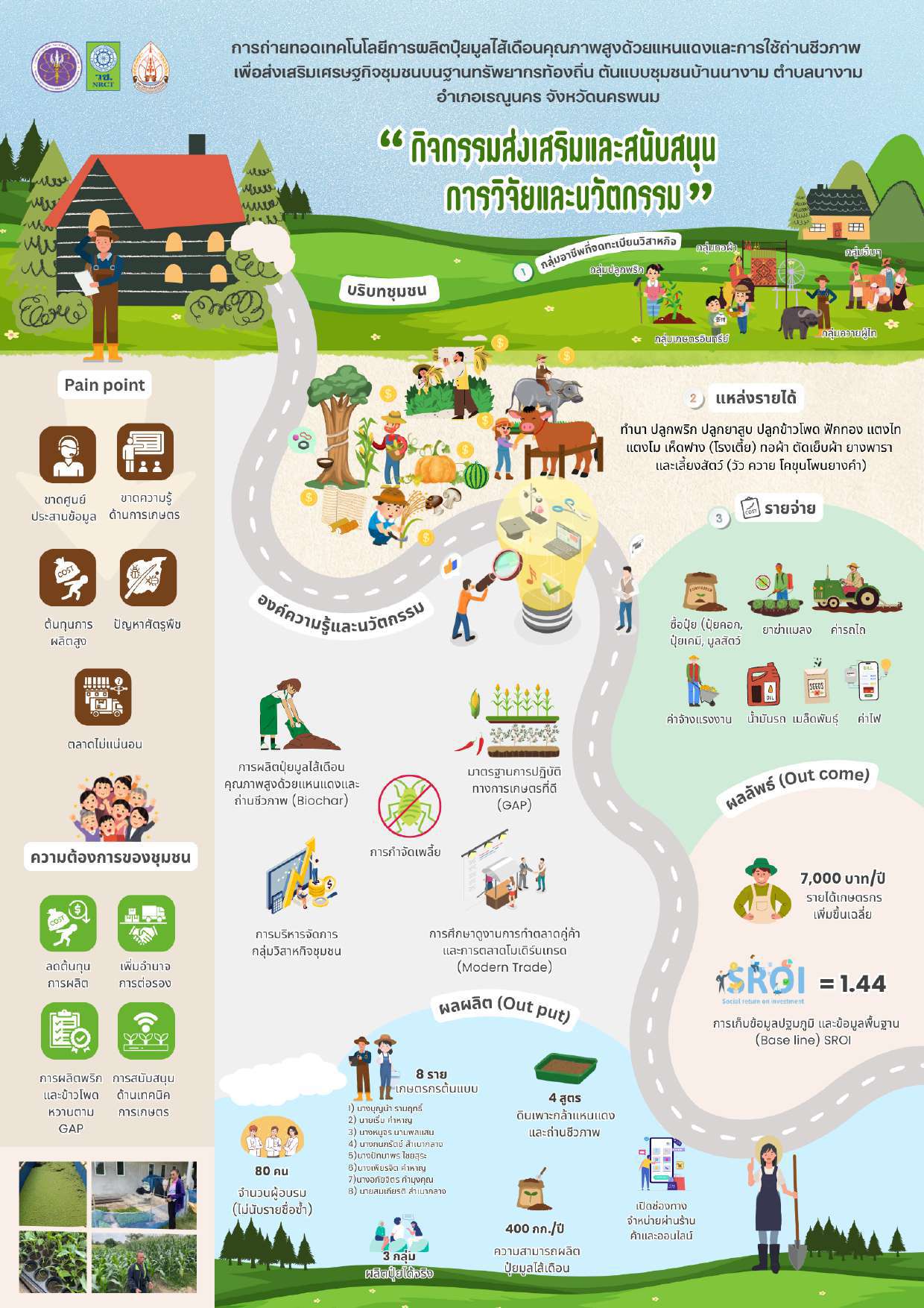 โครงการ "ถ่ายทอดเทคโนโลยีการผลิตปุ๋ยมูลไส้เดือนคุณภาพสูงด้วยแหนแดงและการใช้ถ่านชีวภาพ เพื่อส่งเสริมเศรษฐกิจชุมชนบนฐานทรัพยากรท้องถิ่น ต้นแบบชุมชนบ้านนางาม ตำบลนางาม อำเภอเรณูนคร จังหวัดนครพนม" มีวัตถุประสงค์เพื่อส่งเสริมเศรษฐกิจชุมชนบนฐานทรัพยากรท้องถิ่น ต้นแบบชุมชนบ้านนางาม ตำบลนางาม อำเภอเรณูนคร จังหวัดนครพนม โดยมีวัตถุประสงค์เพื่อเพื่อถ่ายทอดเทคโนโลยีการผลิตปุ๋ยมูลไส้เดือนคุณภาพสูงด้วยแหนแดงร่วมกับถ่านชีวภาพ เพื่อส่งเสริมเศรษฐกิจชุมชนบนฐานทรัพยากรท้องถิ่น ต้นแบบชุมชนบ้านนางาม ตำบลนางาม อำเภอเรณูนคร จังหวัดนครพนม และเพื่อถ่ายทอดเทคโนโลยีการใช้ถ่านชีวภาพ เพื่อส่งเสริมเศรษฐกิจชุมชนบนฐานทรัพยากรท้องถิ่น ต้นแบบชุมชนบ้านนางาม ตำบลนางาม อำเภอเรณูนคร จังหวัดนครพนม การดำเนินโครงการประกอบด้วย 1) การศึกษาสภาพแวดล้อมและความต้องการของชุมชน 2) การพัฒนาและทดลองสูตรปุ๋ยมูลไส้เดือนที่เสริมด้วยแหนแดงและถ่านชีวภาพ 3) การฝึกอบรมและถ่ายทอดเทคโนโลยีแก่เกษตรกรในชุมชน และ 4) การติดตามและประเมินผลการนำเทคโนโลยีไปใช้จริงในภาคการเกษตร ผลจากการถ่ายทอดองค์ความรู้พบว่า สูตรปุ๋ยมูลไส้เดือนที่พัฒนาขึ้นสามารถเพิ่มธาตุอาหารหลักที่จำเป็นต่อการเจริญเติบโตของพืชได้มากกว่าก่อนเข้าร่วมโครงการ 50% ลดการใช้ปุ๋ยเคมีได้มากกว่า 30% และช่วยปรับปรุงคุณภาพดินในพื้นที่เกษตรกรรม โครงการได้จัดการอบรมเชิงปฏิบัติการให้แก่เกษตรกรและประชาชนในพื้นที่กว่า 80 คน ครอบคลุมหัวข้อการผลิตปุ๋ยมูลไส้เดือน การใช้ถ่านชีวภาพเพื่อเพิ่มประสิทธิภาพการเพาะปลูก และแนวทางการพัฒนาเกษตรอินทรีย์ ผลการประเมินพบว่าผู้เข้าร่วมโครงการมีระดับความพึงพอใจสูงมาก ผลการติดตามการใช้ประโยชน์ชุมชนคิดว่าองค์ความรู้ที่ถ่ายทอดสามารถนำไปใช้ได้จริง และสามารถนำเอาองค์ความรู้ที่ถ่ายทอดไปปฏิบัติจริงได้ 100% สามารถนำความรู้ไปเผยแพร่และถ่ายทอดแก่บุคคลอื่นได้ และสามารถให้คำปรึกษาชุมชนได้ คิดเป็น 5.7% ผลลัพธ์ที่ได้ชุมชนมีรายได้เฉลี่ยเพิ่มขึ้นประมาณ 1,000 บาทต่อครัวเรือนต่อเดือน จากการจำหน่ายผลผลิตเกษตรอินทรีย์และปุ๋ยชีวภาพ สามารถผลิตและใช้ปุ๋ยอินทรีย์แทนปุ๋ยเคมีได้จริงในแปลงพริกและข้าวโพด การวิเคราะห์ผลตอบแทนทางสังคมจากการลงทุน (Social Return of Investment หรือ SROI) ของโครงการ เท่ากับ 1.44
