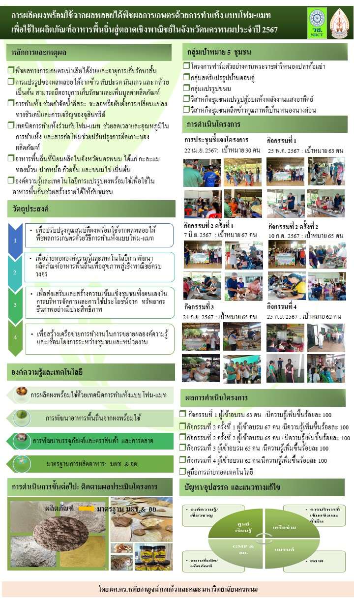 การผลิตผงพร้อมใช้จากผลพลอยได้พืชผลการเกษตรด้วยการทำแห้งแบบโฟม-แมท เพื่อใช้ในผลิตภัณฑ์อาหารพื้นถิ่นสู่ตลาดเชิงพาณิชย์ในจังหวัดนครพนม