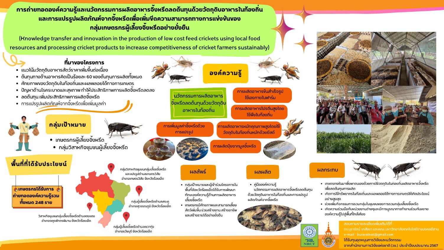 การถ่ายทอดองค์ความรู้และนวัตกรรมการผลิตอาหารจิ้งหรีดลดต้นทุนด้วยวัตถุดิบอาหารในท้องถิ่นและการแปรรูปผลิตภัณฑ์จากจิ้งหรีด เพื่อเพิ่มขีดความสามารถทางการแข่งขันของกลุ่มเกษตรกรผู้เลี้ยงจิ้งหรีดอย่างยั่งยืน