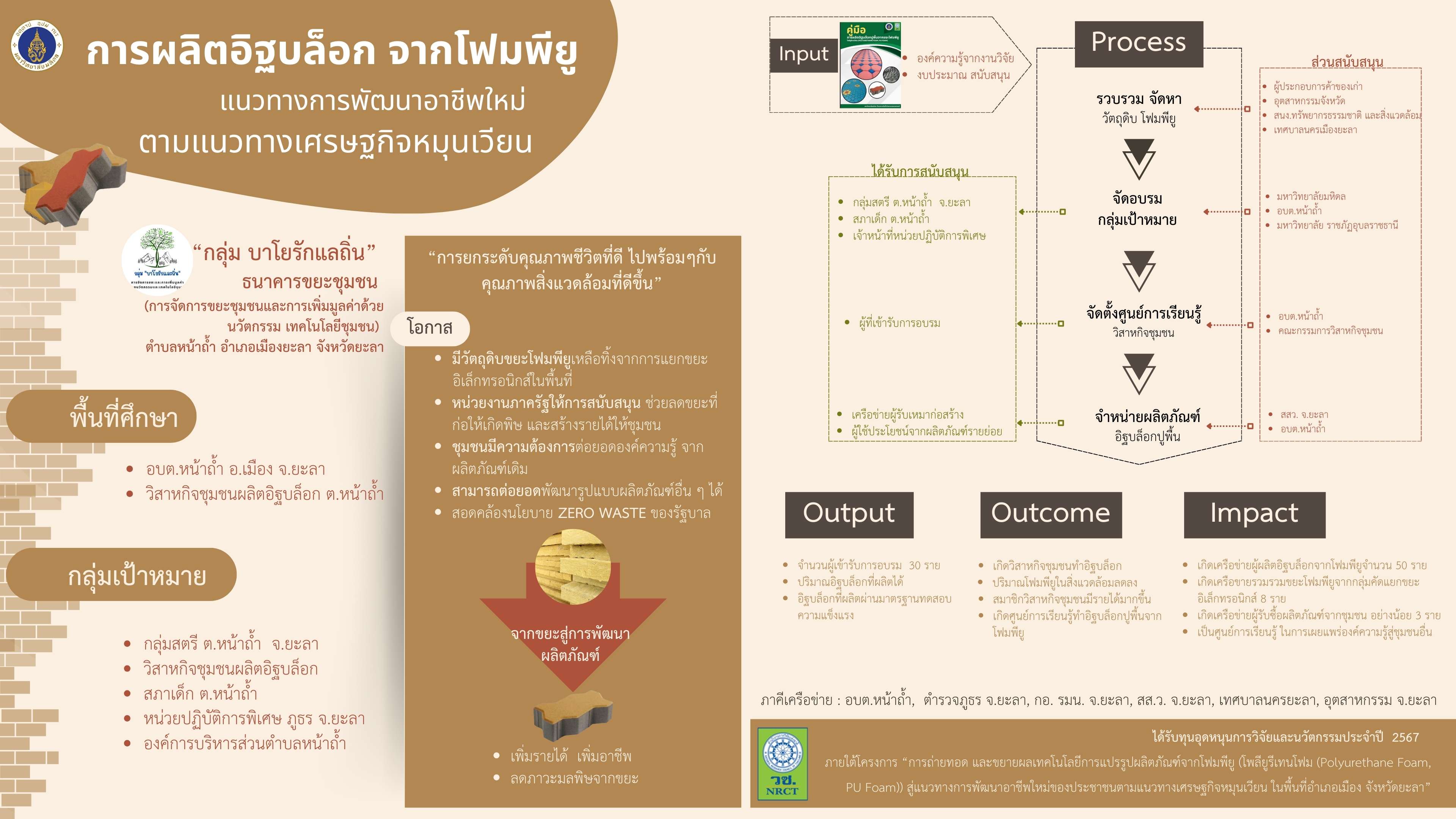 การถ่ายทอดและขยายผลเทคโนโลยีการแปรรูปผลิตภัณฑ์จากโฟมพียู (โพลียูรีเทนโฟม (Polyurethane Foam, PU Foam)) สู่แนวทางการพัฒนาอาชีพใหม่ของประชาชนตามแนวทางเศรษฐกิจหมุนเวียน ในพื้นที่อำเภอเมือง จังหวัดยะลา