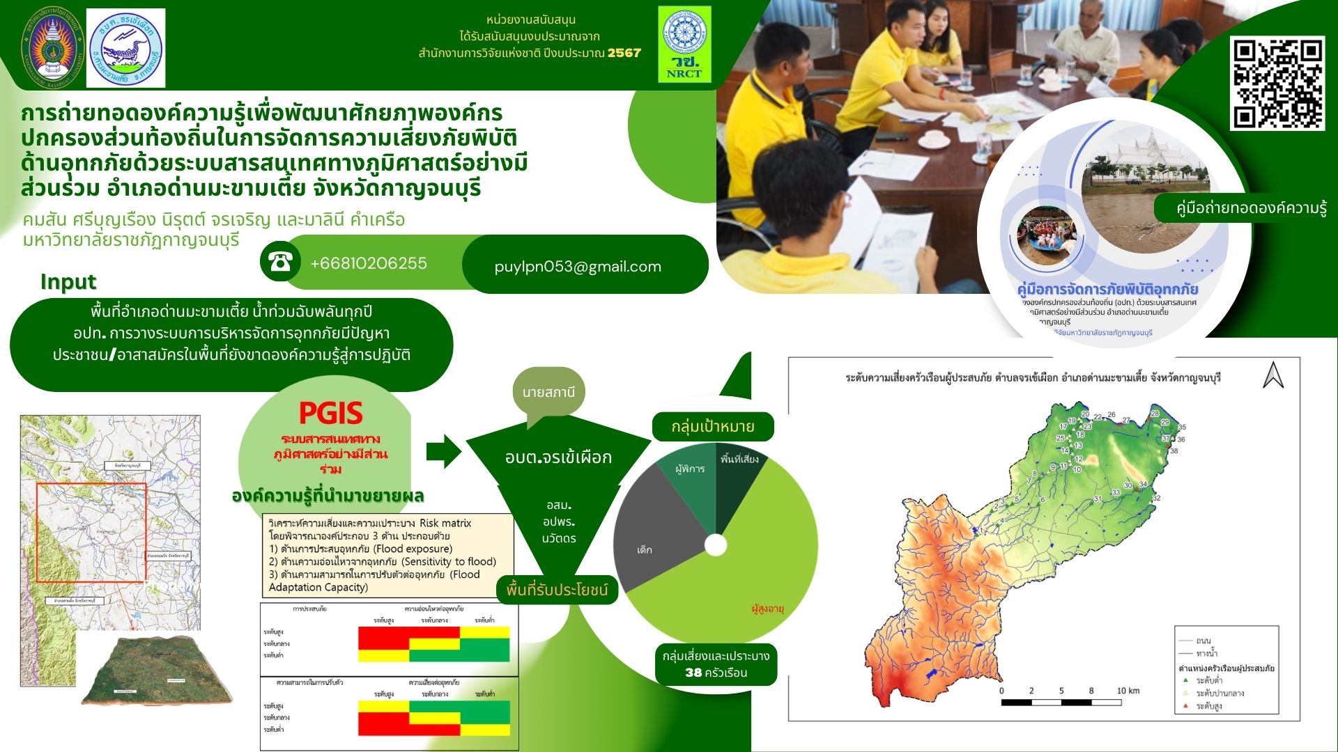 งานวิจัยและนวัตกรรมนี้มีวัตถุประสงค์ในการวิจัย (1) เพื่อจัดทำแผนที่ความเสี่ยงและความเปราะบางภัยพิบัติด้านอุทกภัยด้วยระบบสารสนเทศทางภูมิศาสตร์อย่างมีส่วนร่วม อำเภอด่านมะขามเตี้ย จังหวัดกาญจนบุรี (2) เพื่อถ่ายทอดความรู้การจัดการความเสี่ยงภัยพิบัติด้านอุทกภัยจากข้อมูลแผนที่ความเสี่ยงอุทกภัยและความเปราะบางแก่องค์กรปกครองส่วนท้องถิ่น อำเภอด่านมะขามเตี้ย จังหวัดกาญจนบุรี และ (3) เพื่อถ่ายทอดแผนการปฏิบัติจากการใช้แผนที่เพื่อพัฒนาศักยภาพองค์กรปกครองส่วนท้องถิ่นในการจัดการความเสี่ยงภัยพิบัติด้านอุทกภัย อำเภอด่านมะขามเตี้ย จังหวัดกาญจนบุรี กลุ่มตัวอย่าง ได้แก่ เจ้าหน้าที่องค์การบริหารส่วนตำบลจระเข้เผือก อาสาสมัครป้องกันและบรรเทาสาธารณภัย อาสาสมัครสาธารณสุข และกลุ่มผู้กู้ภัย และครัวเรือนผู้ประสบภัย กรอบในการดำเนินการวิจัย ได้แก่ ระบบสารสนเทศทางภูมิศาสตร์ และการวิเคราะห์ความเปราะบาง และถ่ายทอดองค์ความรู้ด้วยวิธีการเชิงระบบ ผลการวิจัยปรากฏดังต่อไปนี้
